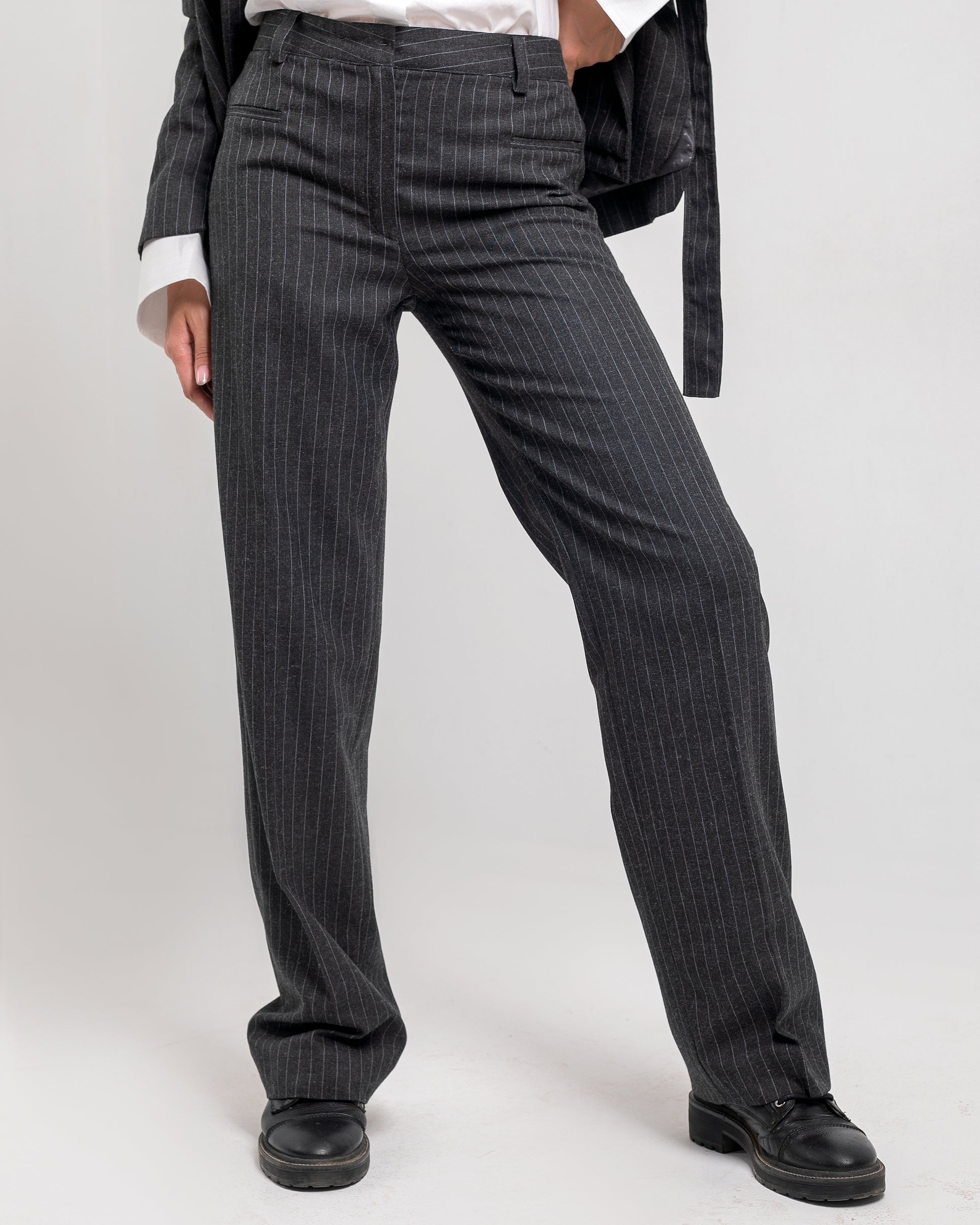 High-waist trousers with belt loops. Front pockets and back buttoned welt pockets. Straight-leg design, Zip, button......Model (height 175 cm) is wearing size 36.